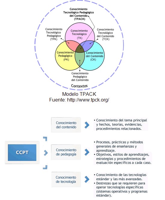 Esa tríada y esa intersección de conocimientos del profesor son las que sustentan el modelo desarrollado desde 2006 con los trabajos de Mishra y Koehler, conocido como TPACK (Technological Pedagogical and Content Knowledge), o modelo CCPT (conocimientos del contenido a enseñar, pedagógicos y tecnológicos), que busca el uso e integración significativa de las tecnologías para mejorar la enseñanza.
